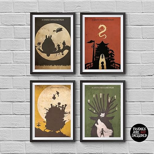 Hayao Miyazaki Minimalist Poster Set 4 My Neighbor Totoro Spirited Away Howl S Moving Castle Princess Mononoke Print Japanese Anime Illustration Manga